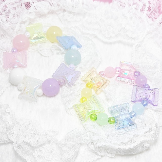 飴細工や琥珀糖…⟡.·*. キラキラの砂糖菓子でできたブレスレットは 虹の上お菓子店のお菓子職人によって つくられています(ˊo̴̶̷̤⌄o̴̶̷̤ˋ)♡ どれも絶品なんだとか……♥ ゴムブレスレットです(^> ·̮ <^) (約16センチ)